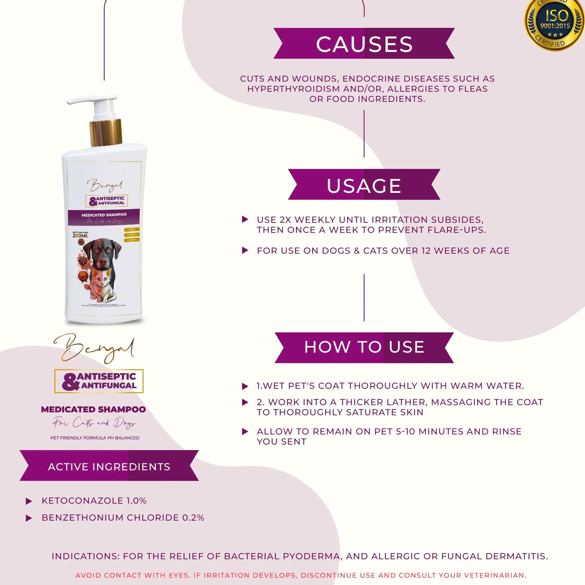 Provide therapeutic relief for your pet's skin irritations with Bengal Antiseptic & Antifungal Medicated Shampoo. This powerful, veterinary-grade formula is specially designed to treat and soothe a variety of common dermatological conditions in both dogs and cats. By combining effective antiseptic and antifungal agents, this shampoo works to eliminate the underlying causes of skin problems, such as bacteria and yeast, helping to alleviate itching, inflammation, and discomfort. It is the ideal solution for restoring your pet’s skin to a healthy, balanced state.