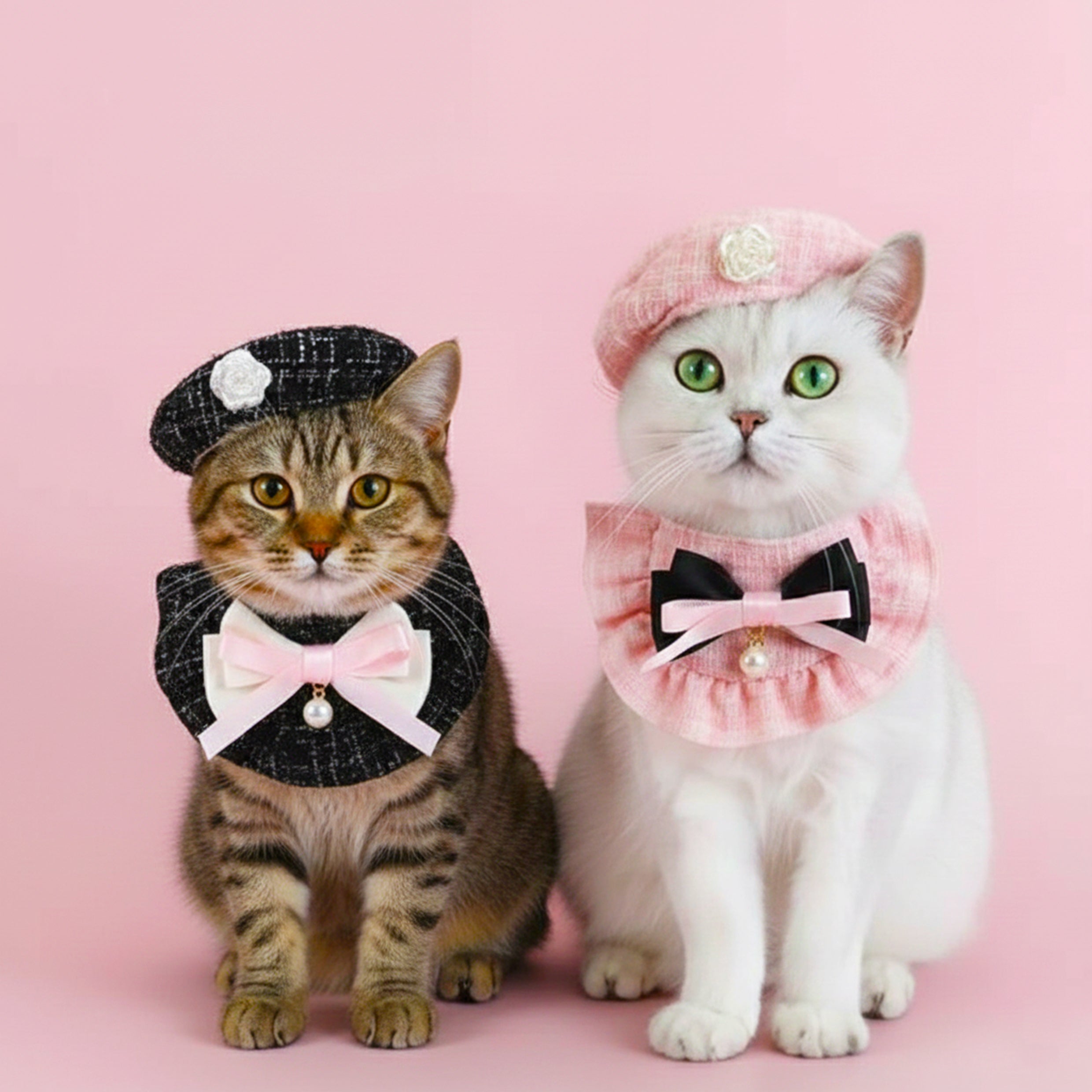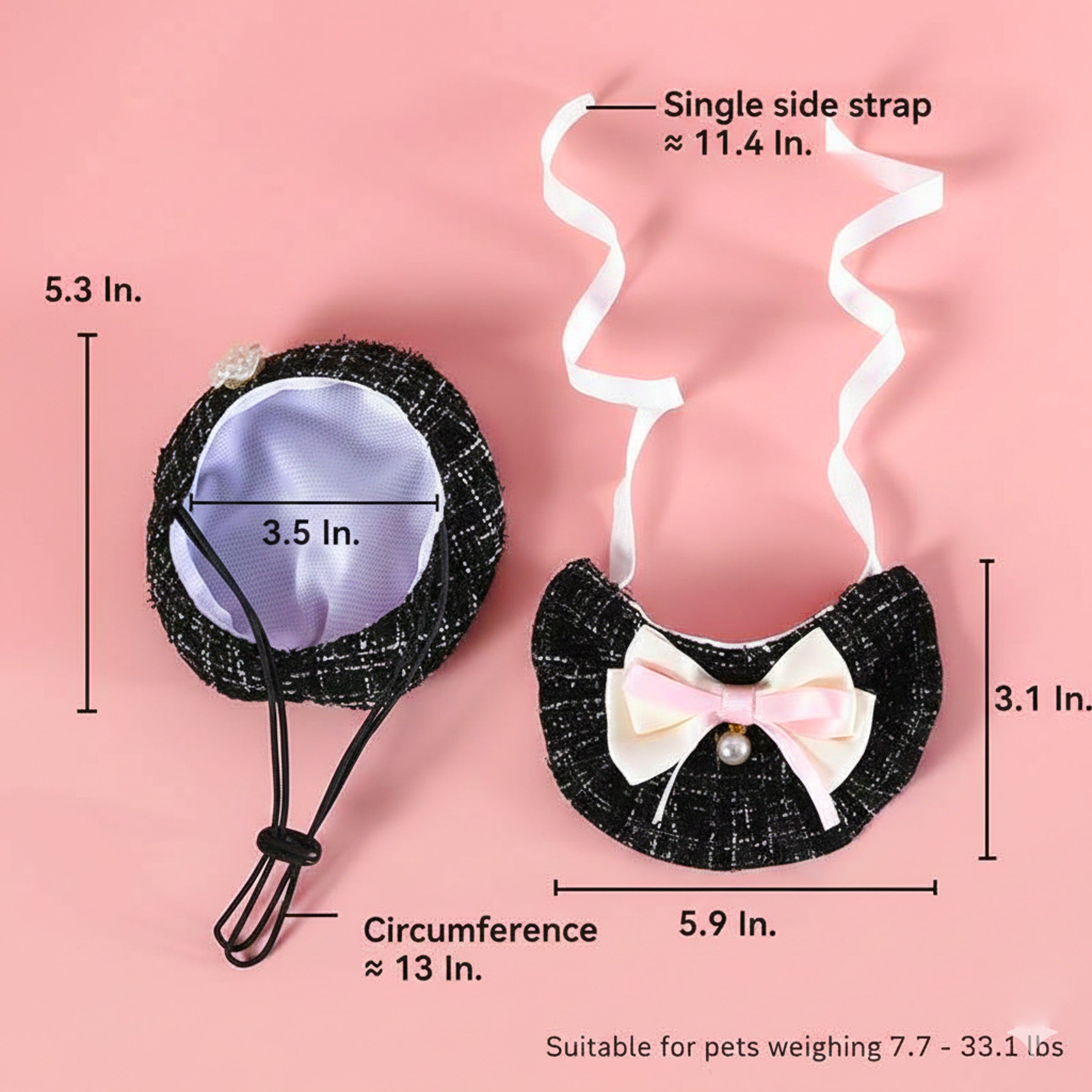 Elegant Pet Costume Set featuring a stylish beret with a 3D white flower and a beautifully crafted bandana with a satin bow. Perfect for pet birthdays, holidays, weddings, and photoshoots, this set offers comfort and elegance with soft, stretchy materials. Available in classic Black and playful Pink to suit any pet’s style. Ensures a perfect fit with an elastic beret band and easy-to-tie bandana.