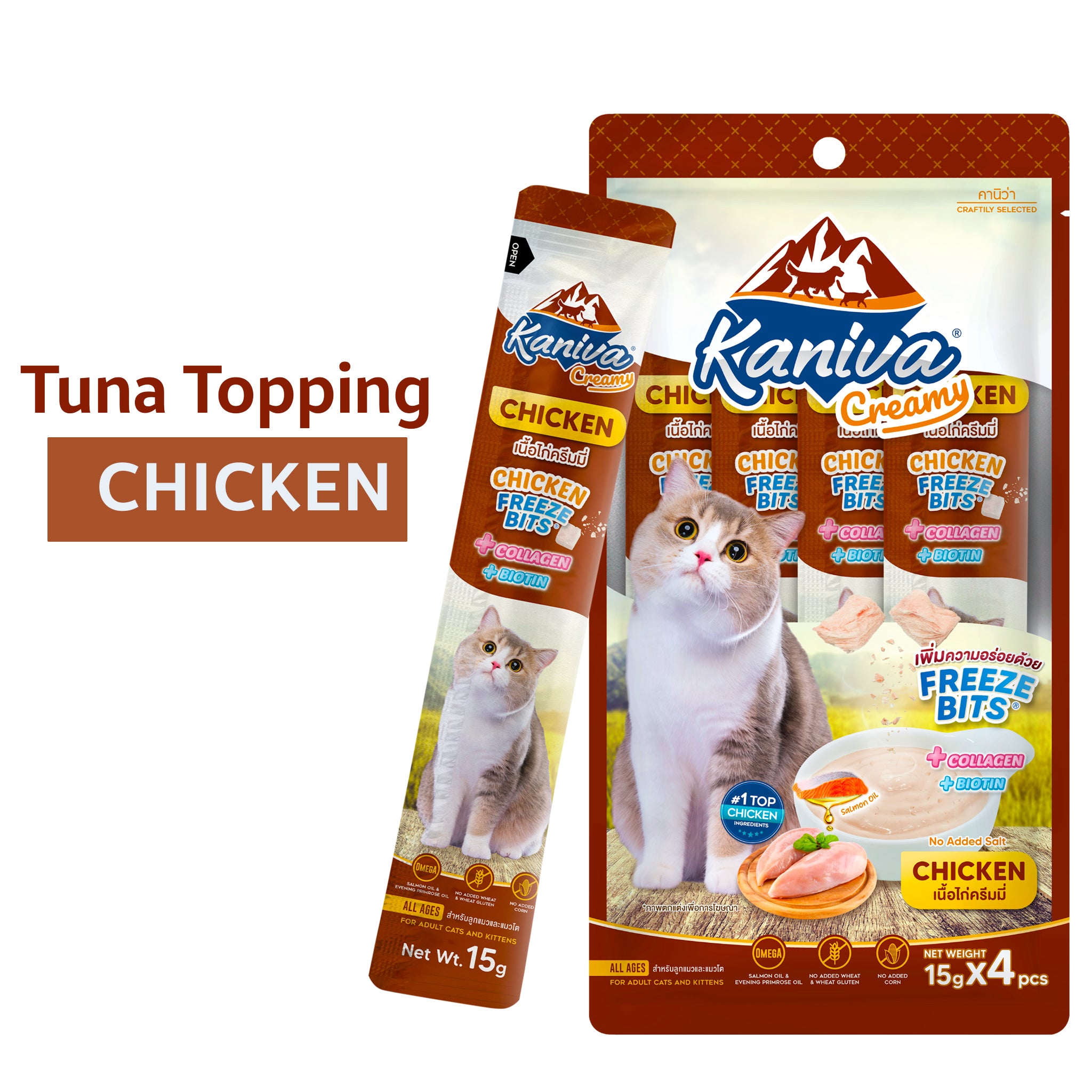 Spoil your cat with the rich taste of Kaniva Creamy Chicken with Chicken Freeze Bits. Made from premium chicken blended into a smooth, lickable texture, this treat features tender chicken freeze bits for extra bite and flavor. Perfect as a snack, reward, or tasty topper, each single-serve 15g tube ensures freshness and convenience.