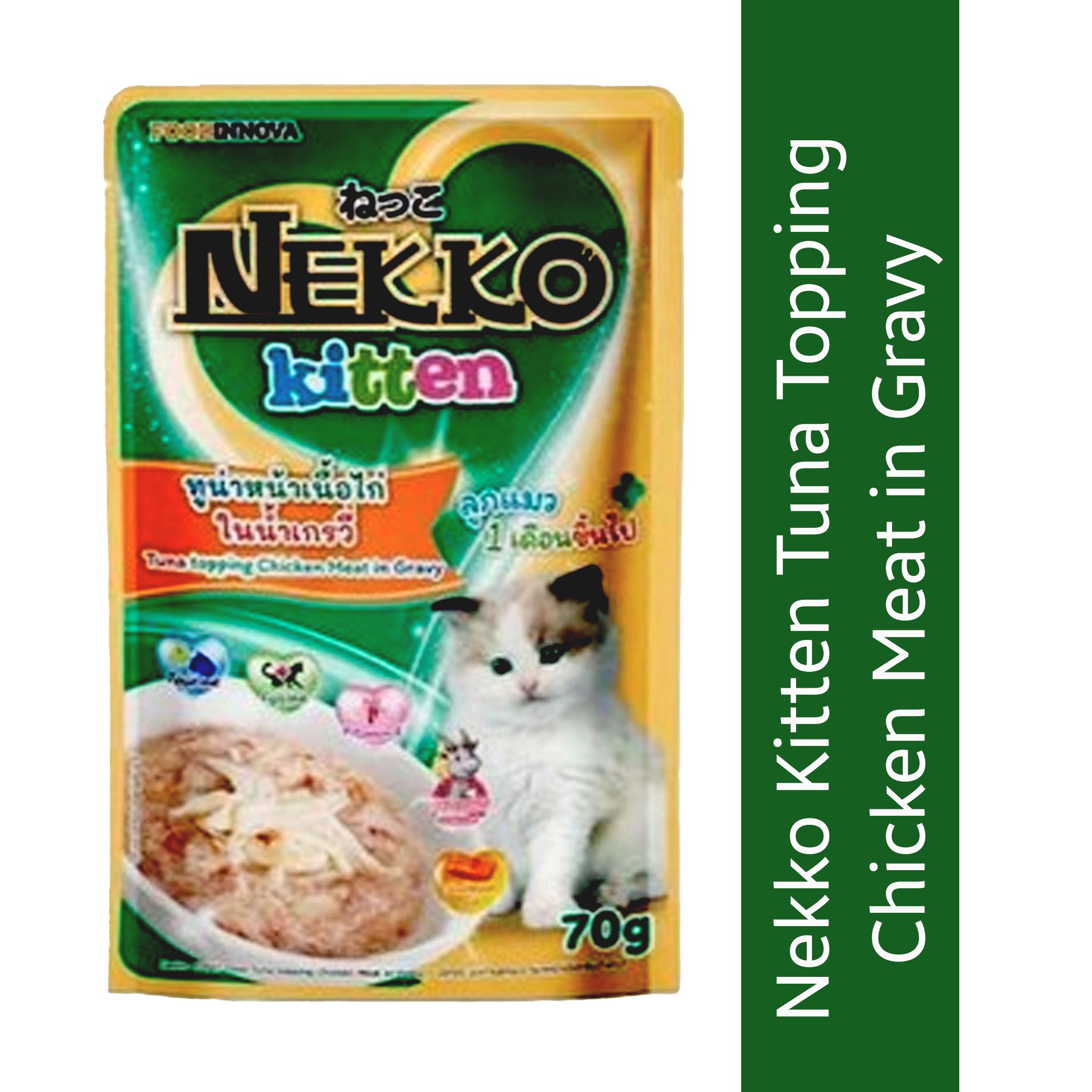 Nekko Kitten Tuna Topping Chicken Meat in Gravy (70g)** is a delicious and nutritious wet food made with real tuna and tender chicken meat, specially designed for growing kittens. Packed with high-quality protein and essential nutrients, it promotes healthy growth, strong muscles, and a shiny coat. The savory gravy adds extra flavor, making mealtime irresistible!