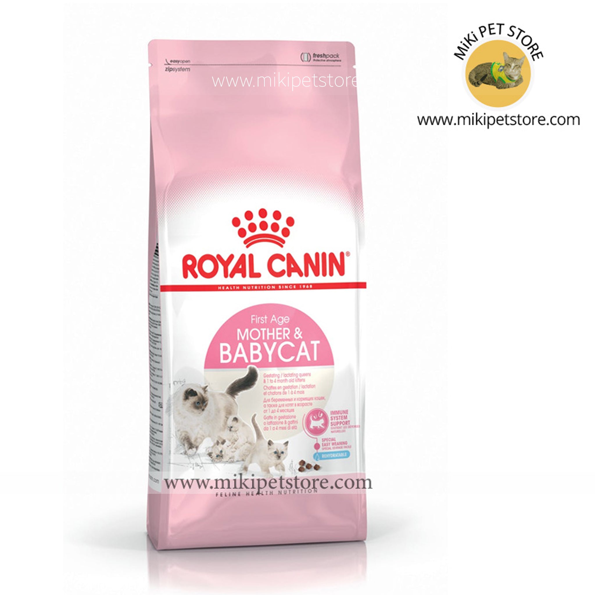Royal Canin Feline Health Nutrition Mother & Babycat Food comes packed with an exclusive combination of antioxidants including Vitamin E for support during the natural immunity decrease in colostrum. An adapted kibble to facilitate the transition from milk to solid food, combined with enhanced digestive tolerance with highly digestible protein (L.I.P.*) and Prebiotics. Suitable for queens during gestation and lactation and kittens from 1 – 4 months.