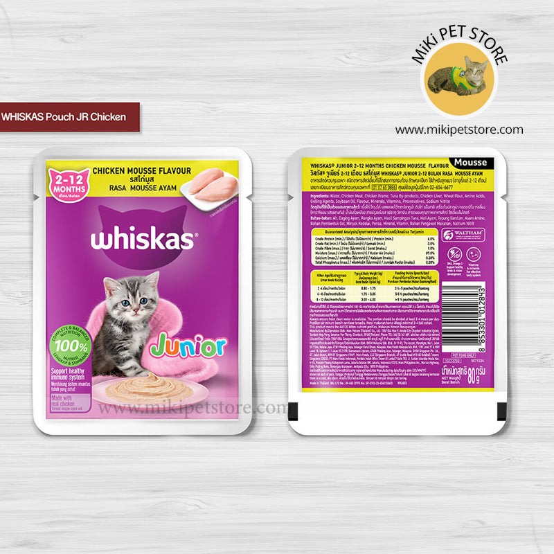 Whiskas Junior Chicken Mousse Flavour is a delicious complete and balanced wet cat food recipe that provide 100% of your kitten's daily needs. It's specifically formulated to meet the specific care and nutrient requirement of an active and growing kitten.